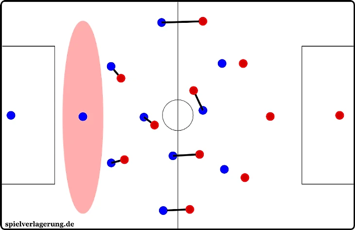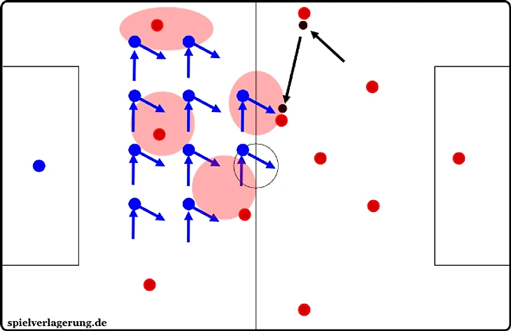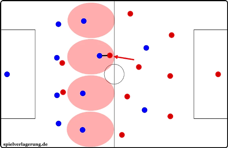 Когда кто-то из игроков покидает свою позицию, чтобы начать персональную опеку, другие игроки должны сместиться по направлению к этой позиции и закрыть свободное пространство, оставляя на дальнем от мяча фланге «коридоры». Недостаток заключается в том, что игроком, который покидает позицию можно легко манипулировать и создавать таким образом численное преимущество.