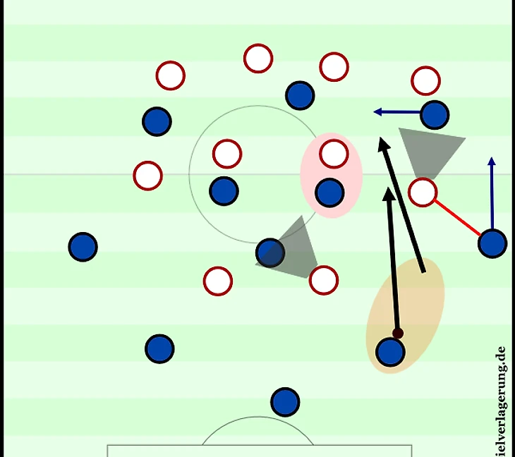 Пример того, как вингер перемещается относительно нападающего, заставляя соперника изменить решение о том, кому отдать пас