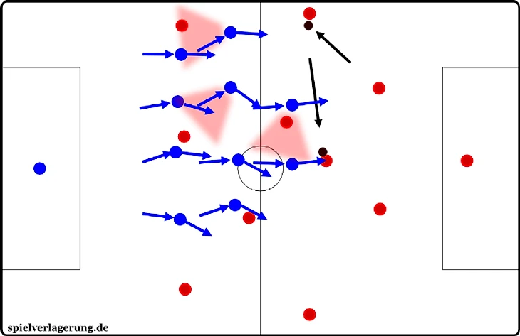 Если команда просто смещается в пространство вокруг мяча без возможности оказать на него давление, то сопернику не составит труда начать манипулировать вашими игроками путем агрессивной игры в пас. Он просто отправит мяч в открытую зону на дальнем фланге, из которой сможет атаковать. Ключ как раз в возможности запрессинговать оппонента так, чтобы тот оказался в безвыходной ситуации и не смог перевести мяч на дальний участок поля.