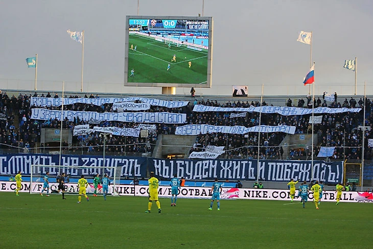 На гостевой трибуне появился плакат «Питер, скорбим», на Вираже – интересные баннеры с цитатами из Кинчева. Перед игрой прошла минута молчания, а вскоре диктор объявил, что «Анжи» и «Зенит» оказали материальную поддержку жертвам трагедии.