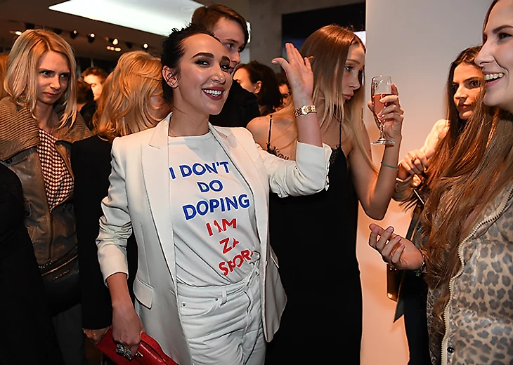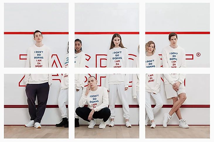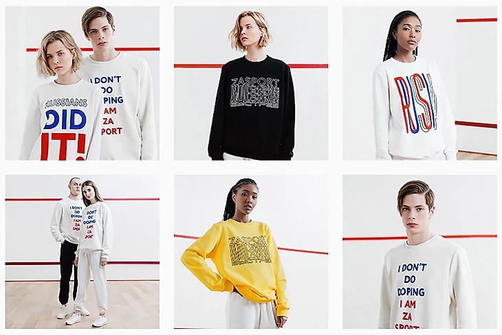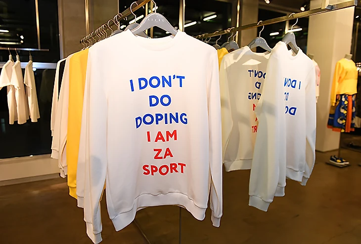 Три года назад, после присоединения Крыма, Задорина выпустила коллекцию футболок с надписями «Санкции? Не смешите мои Искандеры», «Тополь санкций не боится» и т. д. В новой коллекции используется тот же прием: на белых свитшотах и футболках – надписи I don’t do doping I am za sport, Russians did it!, «Старт. Финиш», «Быстрее, выше, сильнее».