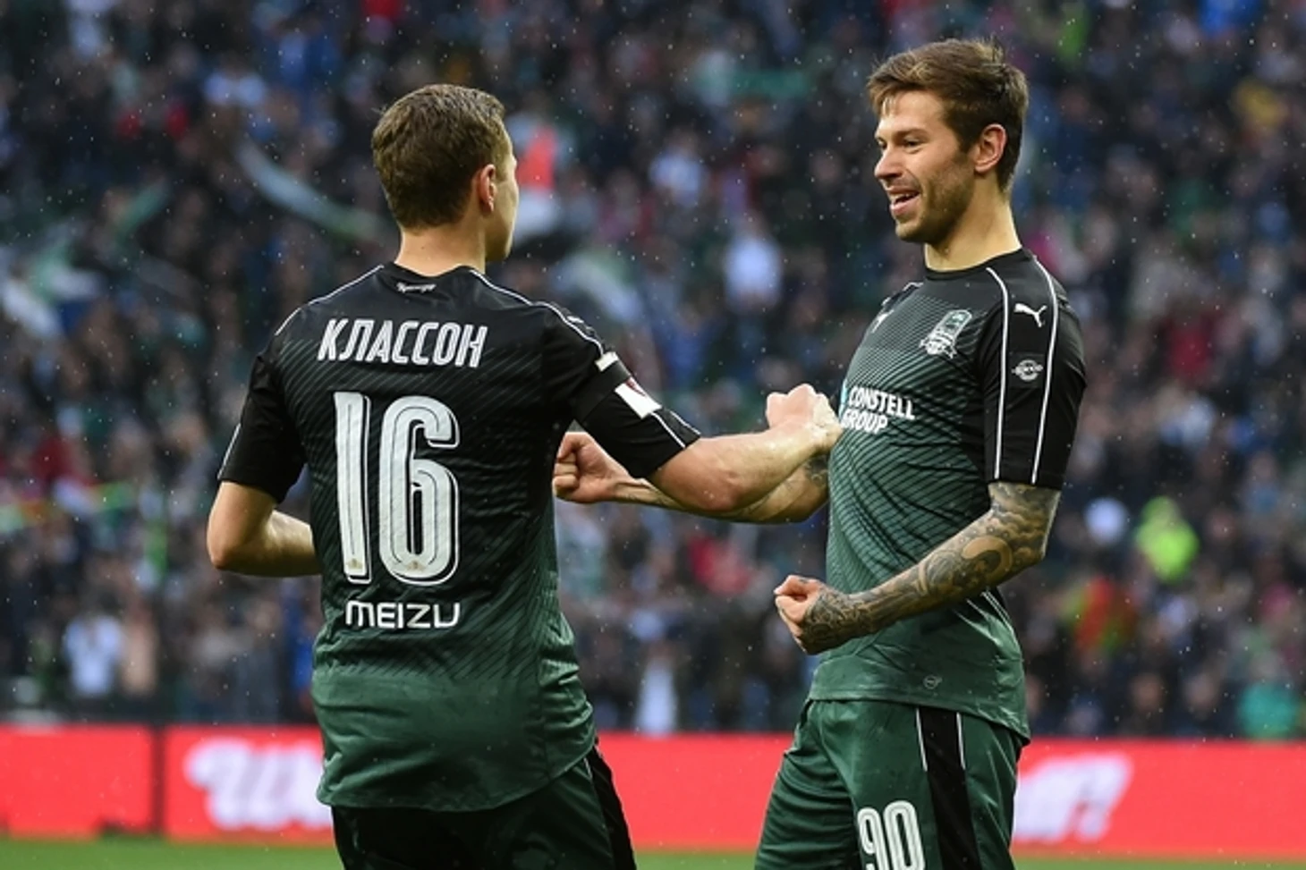 Смолов (справа), опять возобновивший практику поражения ворот соперника, оказывается, стоит 12 млн евро и на него твердо нацелился «Фенербахче». Фото fckrasnodar.ru