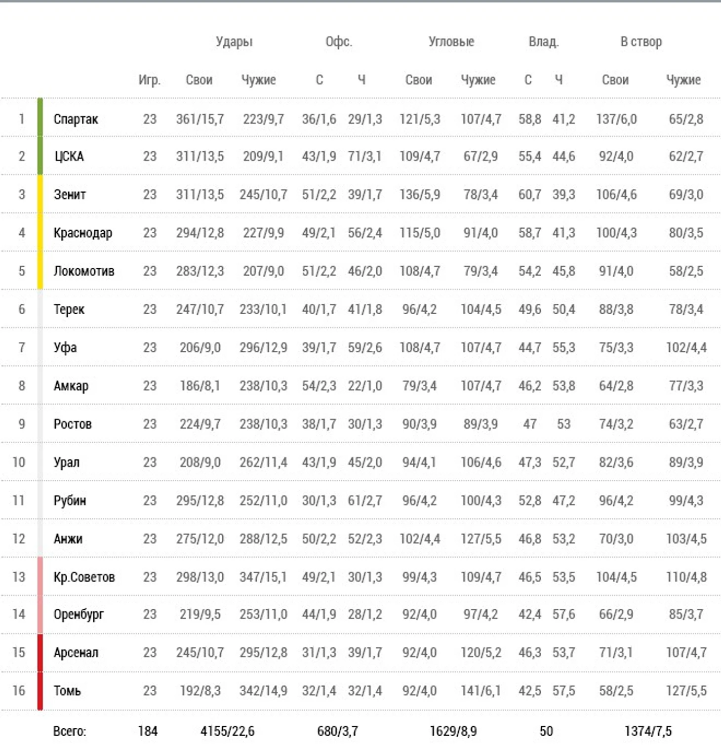 Всего в играх: максимум – «Томь» ( 233; 10,1), минимум — ЦСКА (176; 7,7).