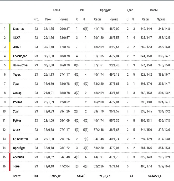 Наибольшее количество предупреждений у футболистов «Анжи» — 57(2,48), а наименьшее – ЦСКА (30; 1,30). 59(2,57) желтых карточек у соперников «Зенита» и всего 33(1,43) – «Локомотива».