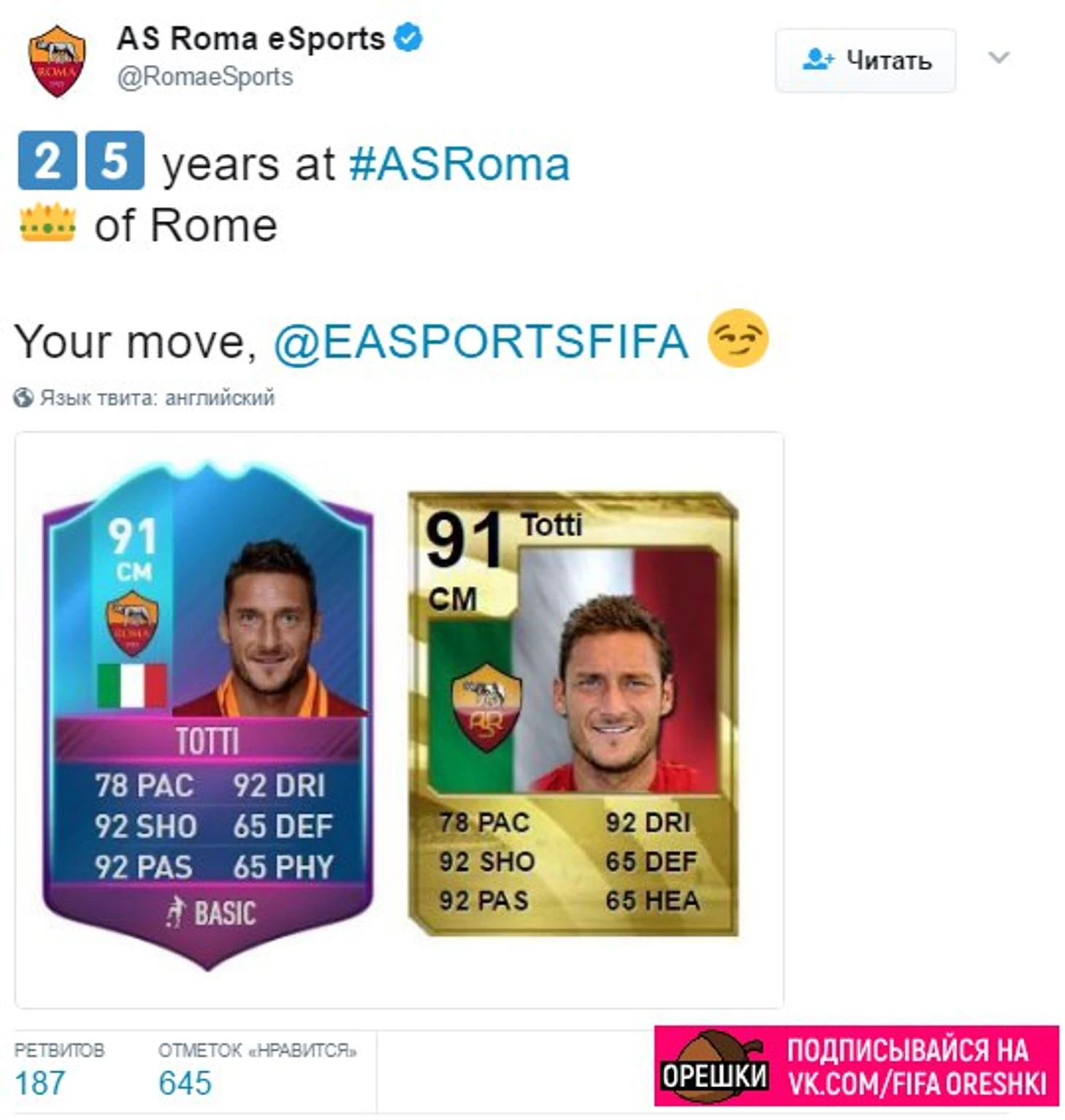«Рома» выпрашивает для Тотти новую карточку и рейтинг в FIFA 17