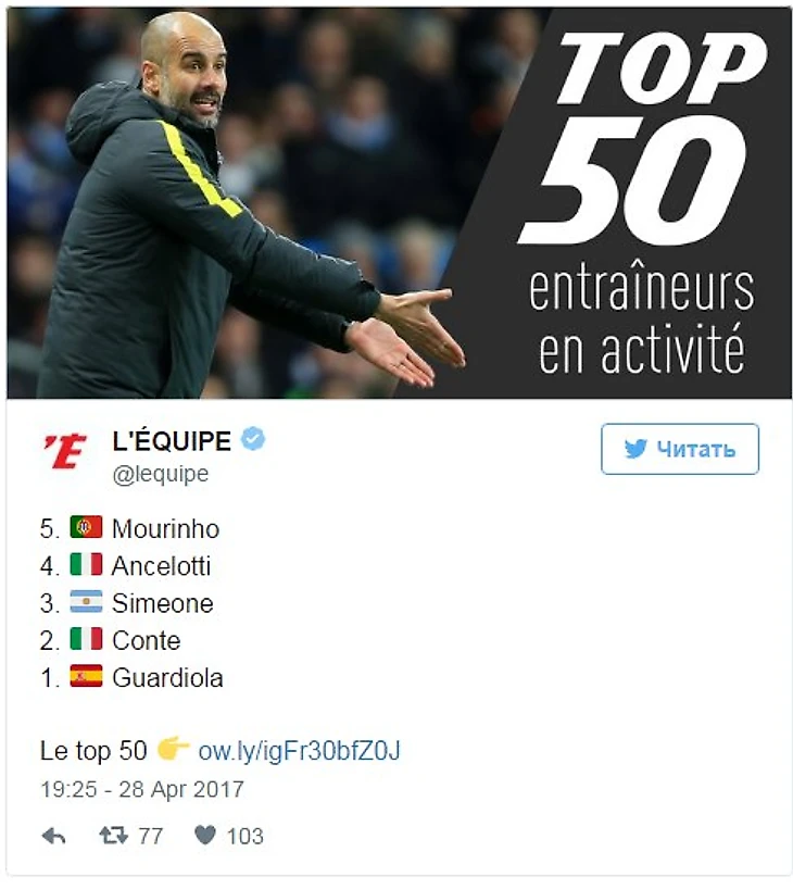 Авторитетное французское издание L’Equipe составило рейтинг 50 лучших действующих футбольных тренеров мира. И согласно голосования 33 журналистов редакции, каталонец занял первое место.