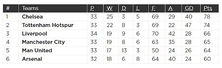 Четыре претендента на два места (третье и четвертое): "Ливерпуль", "Манчестер Сити", "Манчестер Юнайтед", "Арсенал".