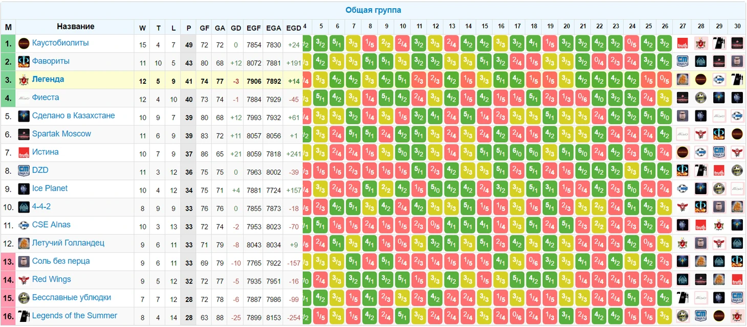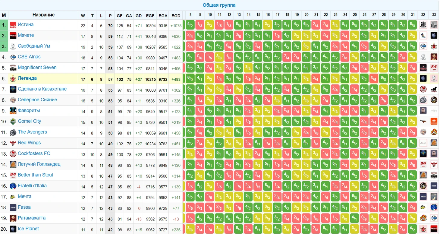 Истину уже не догнать, борьба ведется за топ-3. Наиболее реальным претендентом на данное место видится Мачете, которое уже сейчас занимает второе место и имеет довольно легкий календарь. Ключевые игры в ближайшие туры: Свободный Ум-CSE Alnas в 32-м, Легенда-Свободный Ум в 33-м. Ну и не забываем, что в 34 туре дополнительные игры между собой сыграют соседи по турнирной таблице. Баланс наших встреч с соседями: при равенстве очков мы опредедим Magnificent Seven, но уступим Алнасу, казахам и Мачете.