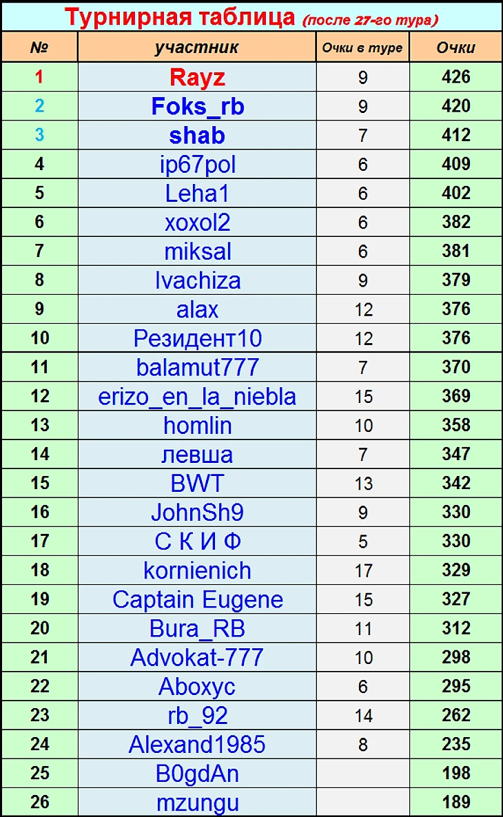 Средняя результативность 27-го тура в Лиге РА - 9,54 очка (худший результат 2 круга)
