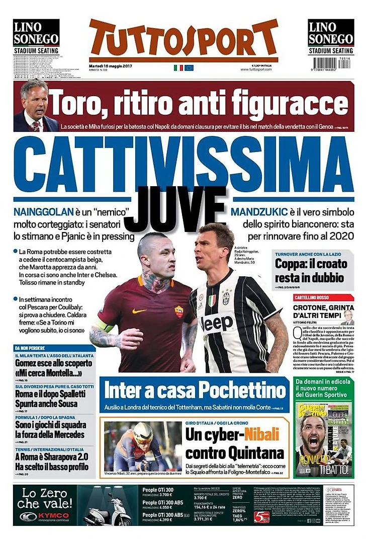 Наингголан – это самый обхаживаемый «враг»: сенаторы его оценили, и Пьянич пускается в прессинг. «Рома» может быть вынуждена продать бельгийского полузащитника, которого Маротта высоко оценивает уже долгие годы. В борьбе за него также «Интер» и «Челси». Толиссо остаётся в режиме ожидания. На неделе встреча с «Пескарой» по Кулибали: попытка закрытия переговоров. Кальдара трепещет: «Если в Турине меня захотят сразу, то я готов». Манджукич – это настоящий символ духа Бьянконери: он продлит контракт до 2020 года.