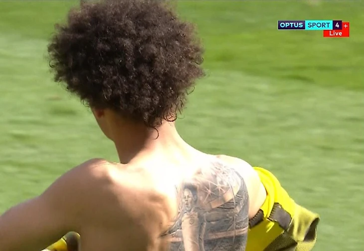 На спине футболиста «Сити» изображен момент празднования гола в ворота «Монако» в Лиге чемпионов. Да, именно после матчей с монегасками английский клуб вылетел из еврокубков.