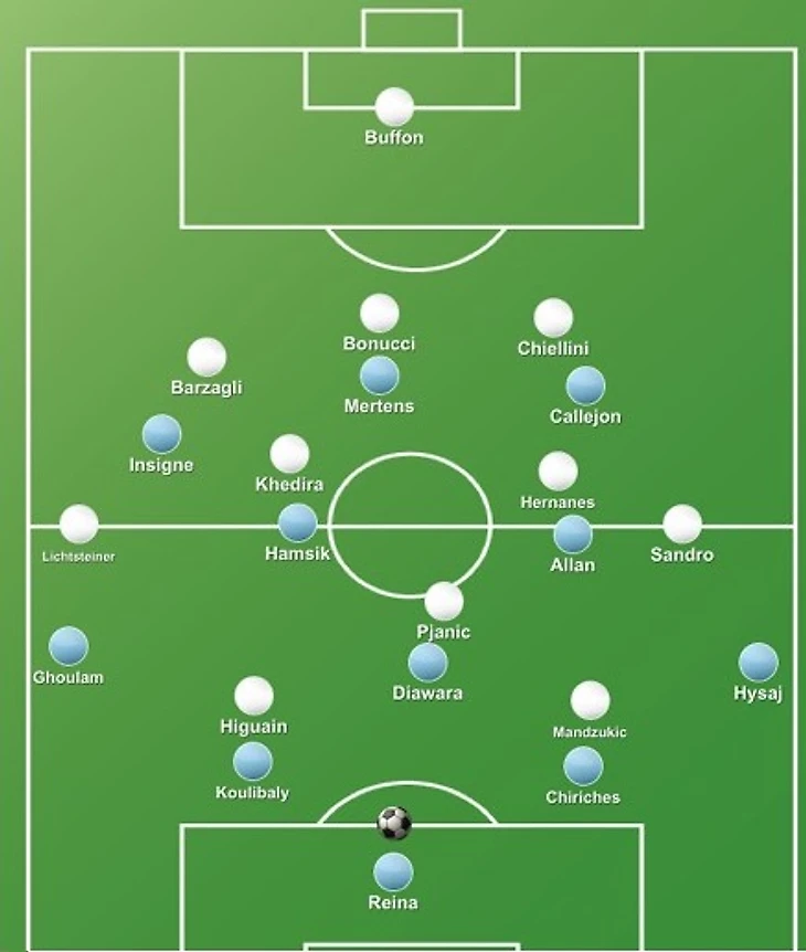 Это пример свободного удара в исполнении "Наполи" в игре между двумя лидерами чемпионата Италии в октябре 2016 года. "Ювентус" выстроился по схеме 3-5-2, а "Наполи" действует в привычном стиле 4-3-3. Туринская троица в обороне опекает трио форвардов соперника, делая это достаточно высоко, но применяя зональную опеку, так как неаполитанцы активно перемещались. Если, например, Мертенс и Кальехон поменялись местами, то Бонуччи опекает испанца, а Кьеллини - бельгийца, поскольку они теперь находятся в этой зоне. Латерали Лихтштайнер и Алекс Сандро стараются держать своих оппонентов в поле зрения, чтобы быть уверенными, что они всегда смогут быстро оказать давление на оппонентов в случае передачи. В полузащите "Юве" также выставляет опекунов под каждого неаполитанца, а оба форварда контролируют пару центрбеков.
