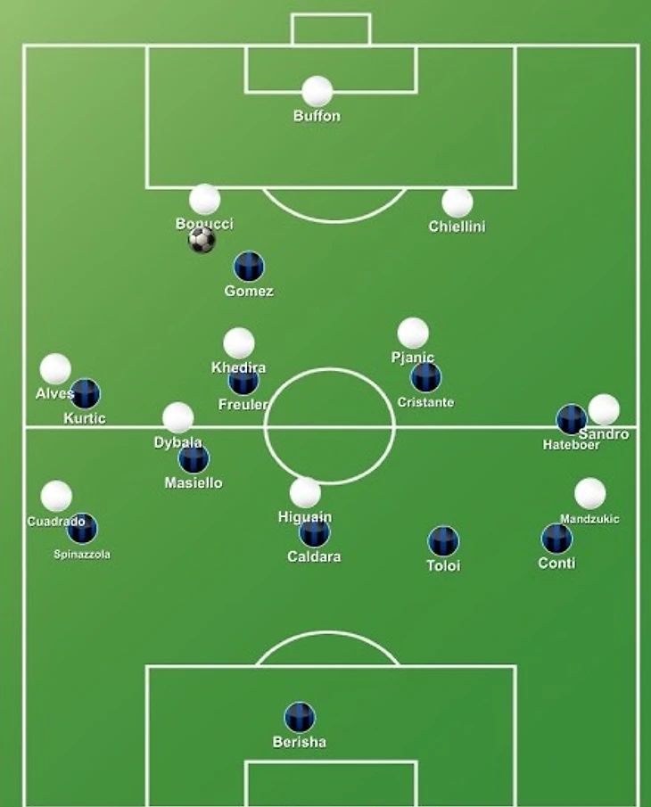 Алехандро Гомес был единственным центральным нападающим и не имел прямого оппонента для опеки, в результате чего его задачей оказался прессинг центрбека с мячом, чтобы тот не смог переключить игру на партнера по линии. Кристанте и Фройлер в агрессивной манере плотно работают с центральными хавбеками "Юве", когда как Куртич и Хатебур опекают крайних защитников. Андреа Масиелло следовал повсюду за Пауло Дибалой, а Маттиа Кальдара делал то же самое с Гонсало Игуаином. Вингбэки Спинаццола и Конти следили за вингерами, в то время как Рафаэль Толой прикрывал партнеров с тыла. Мы видим такой подход на видео ниже.