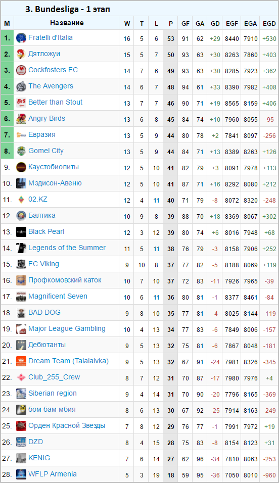 В 3.Бундеслига места с 9 по 28 актуальны в ниже приведенной таблице, которая сформировалась по итогам 1 этапа соревнований: