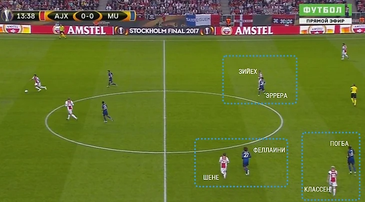 У француза было время, чтобы оценить ситуацию, и этим, как казалось, почти воспользовались Санчес и Классен в попытке заблокировать удар. Нельзя также не отметить, что гол пришел именно с левого фланга защиты "Аякса", и даже смещение туда чуть ли не половины команды не помогло помешать переводу мяча в центр. Две важнейшие зоны, как писалось выше...