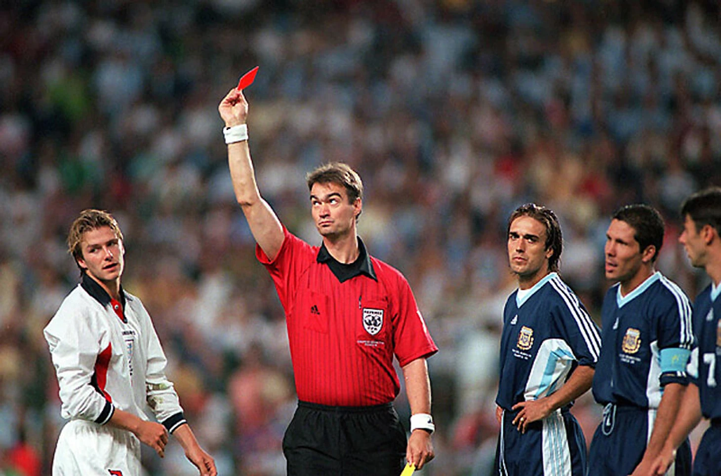 В 1/8 финала и разыгралась очередная трагедия английского футбола, непосредственным участником и отчасти виновником стал Дэвид Бекхэм. Матч «заклятых» соперников Аргентина – Англия. Со времен войны за Фолклендские острова любой матч между ними превращался в битву не на жизнь, а на смерть, когда тактика уступает место ярости и желанию. Так получилось и в этот раз. Сумасшедший первый тайм, который закончился со счетом 2-2. Майкл Оуэн забил в этой игре свой легендарный гол с передачи Дэвида. Ну а в самом начале второго тайма произошел эпизод, превративший Дэвида Бекхэма во «врага нации номер один». На 47 минуте Бекхэм получил грубый толчок в спину от капитана Аргентины Диего Симеоне, который после этого еще наклонился и незаметно ткнул Дэвида рукой в затылок. Лежащий на газоне Бекхэм лягнул обидчика, после чего будущий тренер «Атлетико» Мадрид, с громким криком повалился на газон и стал кататься по нему, изображая смертельную боль. Все это было на глазах главного судьи матча Кима Милтона Нильсона, который наградил Симеоне «горчичником», а Бекхэму предъявил красную карточку и удалил с поля. Игра моментально закрылась. Одни не хотели рисковать, другие не могли взломать оборону. Но при этом в экстра-тайме произошло еще одно событие, которое поставило под сомнение квалификацию датского рефери. Сол Кэмпбелл забил после углового «золотой гол» в ворота Аргентины, но Нильсон, неожиданно для всех, гол отменил. Игра докатилась до серии послематчевых пенальти, которую англичане традиционно проиграли.