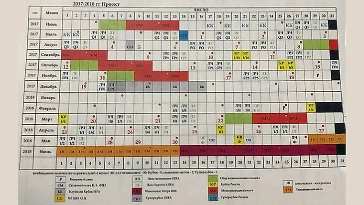 Но это только первая проблема. Вторая также связана с вопросом сборной. Новый сезон Премьер-лиги стартует 13 июля, а завершить его планируется уже 13 мая, за месяц до старта Чемпионата мира. Вот так выглядел проект календаря в начале года, сейчас в него будут внесены незначительные изменения:
