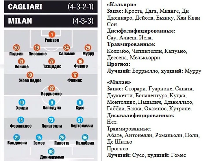 - Сардинийцы не могут обыграть «Милан» уже на протяжении 12 матчей: 5 ничьих, 7 поражений, при этом даже не сумев забить в 6 из таких поединков.