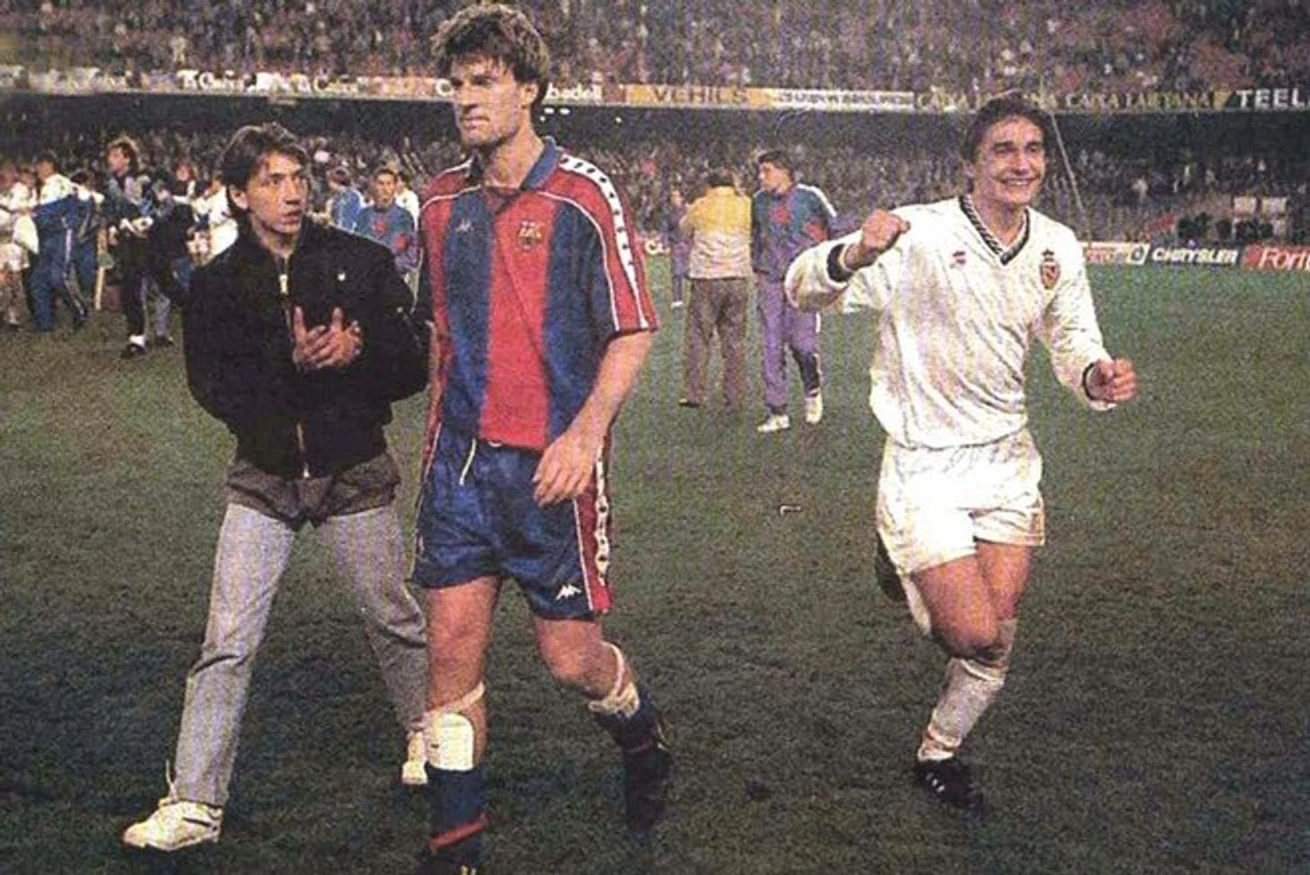 Внесу ясность в причины потасовки. Как самый трезвый и объективный человек на тот момент, хочу заявить следующее: изрядно подвыпивший Миша Соколов, как человек нервный, неправильно оценил жест двухметрового скинушки,хотевшего поменяться с ним значками или марками (наверное) и оглоушил последнего ножкой в челюсть. Ну и понеслось... Взорам свободолюбивых каталонцев предстала картина гонения потомков Колумба.После того победного матча все погрузились в автобус и уехали.