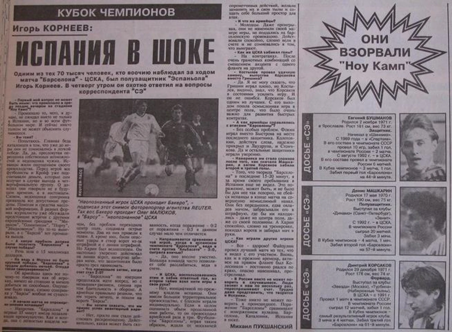 Ну, после стольких трудностей на начальном этапе, было бы неразумно покинуть этот благодатный край, ну, конечно, жажда приключений, тем более, что на каждом шагу мы чувствовали теплое отношение местного населения, в основном торговых работников. До тех пор, правда, пока эти безумцы (речь идет о футболистах) не выиграли у “Барсы”. После этого нас перестали уже угощать пивом. Но Каталония это еще не Испания. В то время, как местные сепаратисты рвали себе волосы на задницах, оставшаяся часть Испании встречала нас, как героев. 6 ноября (матч был 4-го) мы отправились в Мадрид и побывали там, на матче «Реал» - «Эспаньол». Незнакомые люди жали нам руки с фразами: «фак, фак, «Барса». Мы были в хоккейных сетках ЦСКА и являлись объектами вожделения . Кульминацией стало многотысячное скандирование на стадионе «Сантьяго Бернабео»: «Те-Се-Ка, Те-Се-Ка!!!» В Мадриде «Барселону» не любят.