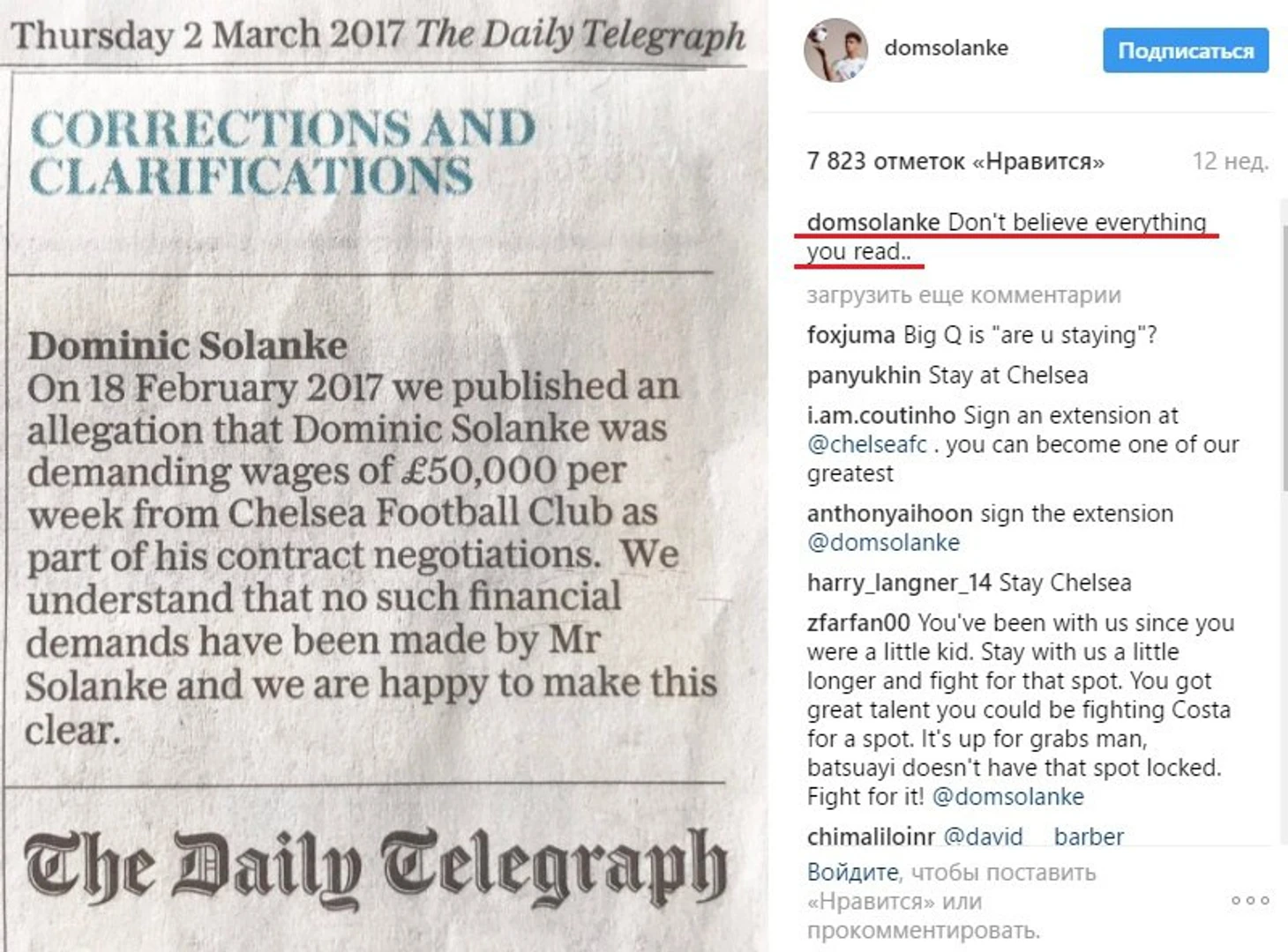 Тему подхватил авторитетный Telegraph, новость опубликовал не первой странице со всей предысторией: сыграл всего один матч на взрослом уровне (вышел на замену в Лиге Чемпионов с «Марибором»), за год аренды в чемпионате Голландии забил всего семь голов в 25 играх. Фото в инстаграме из ночных клубов, с дорогими авто сами сделали своё дело. В итоге: Дом стал получать гневные сообщения в твиттер от болельщиков, после чего подал жалобу на издание. Telegraph написал опровержение, а тинэйджер разместил его в инстаграме со словами: «Не верьте всему подряд, что читаете».
