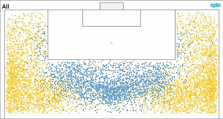 И здесь удары представляют большую угрозу, чем подачи. Это немного оправдывает решение Месси, потому что есть в футболе ещё и такие нюансы как: усталость, расположение соперников, текущий счёт и т.д. Отметим, что в 68% случаев с таких позиций наносились удары.