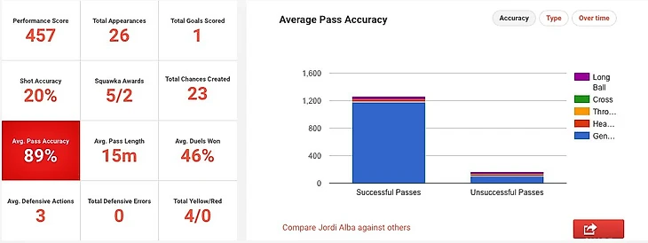 Как уже отмечалось, испанец превосходит всех по точности пасов. Рассмотрим подробнее таблицы точности передач Милнера и Альбы: