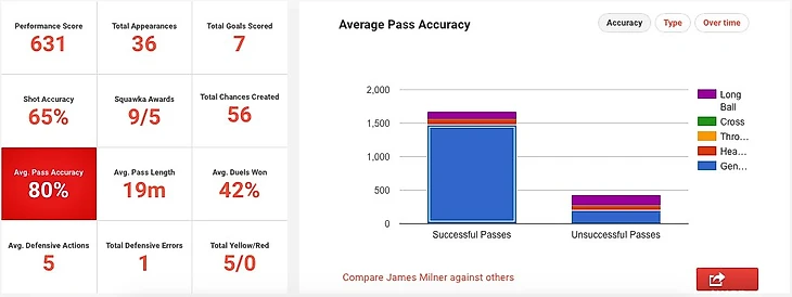 Итак, Джеймс провел больше минут на поле. Являясь штатным пенальтистом Ливерпуля, реализовал 7 пенальти из 8. Это больше, чем у бразильца (2 гола) и испанца (1 гол). У Марсело просто аномально высокий уровень ассистов для защитника: целых 10, против 6 у Альбы (отличный результат) и 3 у Милнера (хорошо). Интересный факт: половину своих голевых пасов фулбэк сливочных выдал на Роналду. Ни на что не намекаю. Также его можно похвалить за аккуратность - только пара желтых на весь чемпионат. У соперников средний результат по карточкам. Вся стата представителя вице-чемпионов Испании неприметная. Единственный пункт, где он намного сильнее, это точность пасов - впечатляющие 89%! Почему так, мы разберем ниже в разделе "Передачи".