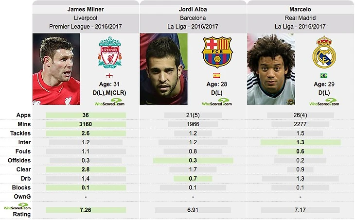 Звание лучшего игрока матча Милнер и его главный конкурент Марсело получали по два раза. Альба - ни разу. Милнер становился лучшим в матчах со Суонси в гостях 1-2 (решающий гол с точки на 84-й минуте) и в дерби с Эвертоном дома 0-1 (добивание Мане на последних секундах). Бразилец был абсолютно лучшим в тяжелейшем поединке против Вильяреала 2-3 (камбэк с 0-2), а также на Барнабеу против Валенсии 2-1 (забил второй гол Реала под концовку матча). Все хорошо у всех в атаке. Но как дела в защите? Это основной показатель, ведь защитник должен прежде всего защищать.