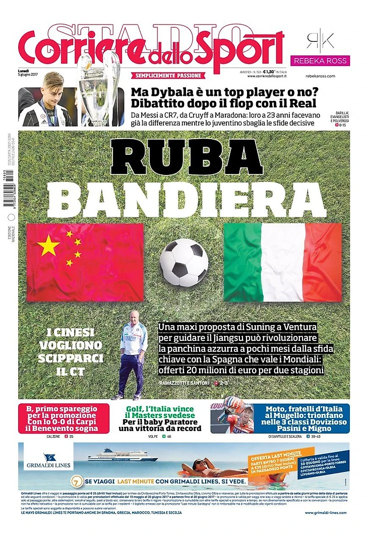 Китайцы хотят забрать главного тренера сборной. Огромное предложение Sining для Вентуры, чтобы он возглавил «Цзянсу», может устроить революцию на скамейке Адзурри за несколько месяцев до ключевой схватки с Испанией, которая стоит выхода на Мундиаль: предложено 20 миллионов евро за два сезона.