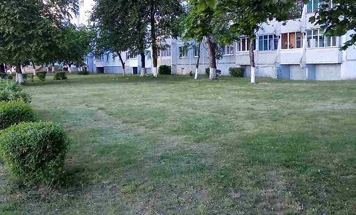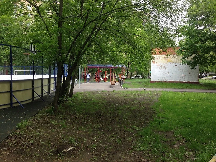 Простой квадрат травы посреди бетонных коробок. Ромашки, кусты. Рядом дорога. Ворота именно такие, каких следует ждать в такой ситуации – два дерева. Мужик с первого этажа, как раз прямо за этими деревьями, мог бы представлять, что ему повезло жить в вип-ложе. Вместо этого он боялся, что мы прицелим ему в окно. Предупреждения на нас не подействовали. И он начал мстить.