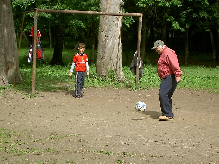 Но я все же взрослел, у меня появился младший брат, которого надо было выгуливать в парке. Бабушка везла коляску, а я брал резиновый мяч со зверушками, от которого всегда очень вкусно пахло пластмассой, и выходил на землю парка Братцево, перемешенную с травой и корягами. Все свои коленки я разукрашивал именно там, но главные особенности того поля были немного другие. Во-первых, рядом были два небольших оврага с разрушенными постройками, и если мяч попадал туда, приходилось бежать вниз по крапиве и с мыслями, что там тебя обязательно схватят бомжи. Во-вторых, одни из ворот не падали только благодаря тому, что их основание было придавлено огромным пнем.
