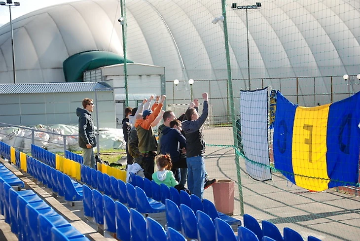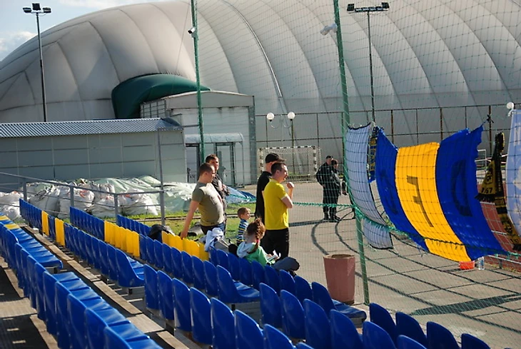 Вообще, интересная планировка у этого стадиона. Основная трибуна с комфортным обзором (вечернее солнце не слепит) – совсем маленькая. Вторая трибуна, в три раза более вместительная, закрыта для зрителей, она совсем пустая, кроме небольшого гостевого сектора.