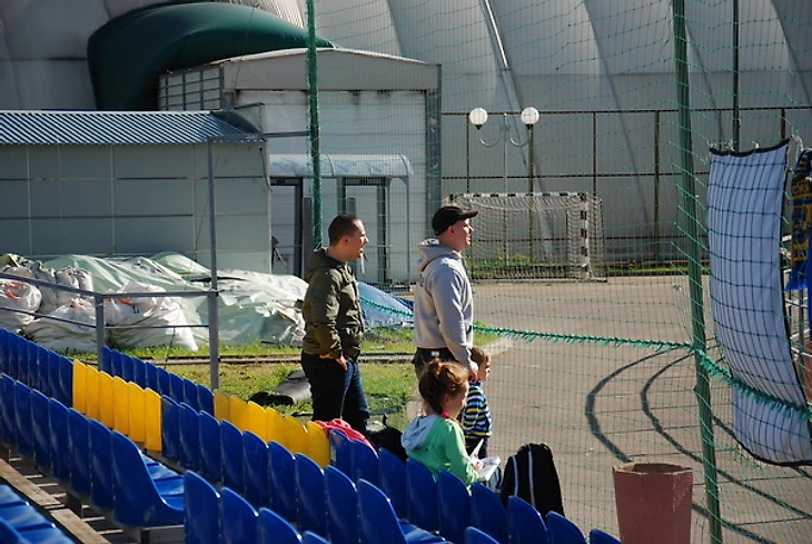 Пришлось пойти на огороженный зеленой сеткой гостевой сектор. К чести стадиона «Янтарь» надо сказать, что основная часть трибун не занавешена сеткой, как часто бывает на стадионах низших дивизионов. За это ему, стадиону «Янтарь», большое спасибо.