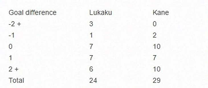 Вот так так. 34% своих голов Кейн забил, когда «Тоттенхэм» уже имел положительную разницу в два мяча, и вообще не забивал, когда «шпоры горели» с -2. Последнее, кстати, случалось совсем уж редко, потому нерепрезентативно.