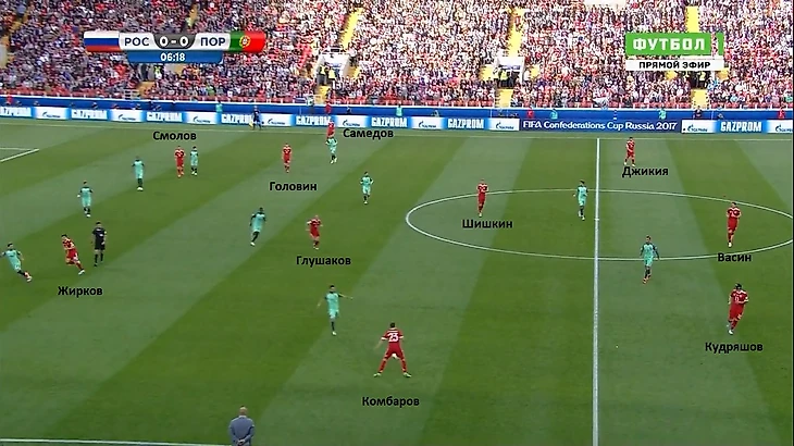 Как и предполагалось, на игру с Португалией команда Черчесова вышла со схемой 5-4-1, которая трансформировалась в 5-2-3. Жирков и Головин играли чуть выше пары центральный полузащитников – Глушакова и Шишкина. Самедов и Комбаров закрывали всю бровку, но редко убегали к угловым флажкам при прессинге, опасаясь быстрых контратак соперника.