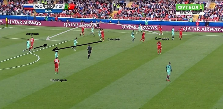 Тройка нападения Жирков – Смолов – Головин меняла свою тактику в зависимости от того, у кого на данный момент мяч. Если мяч был у сборной России и команда разыгрывала атаку из глубины, то они связывали работой защитников Португалии, освобождая фланги для подключения крайних защитников. Если снаряд переводился ближе к уголовому флажку, то тройка смещалась в сторону мяча.