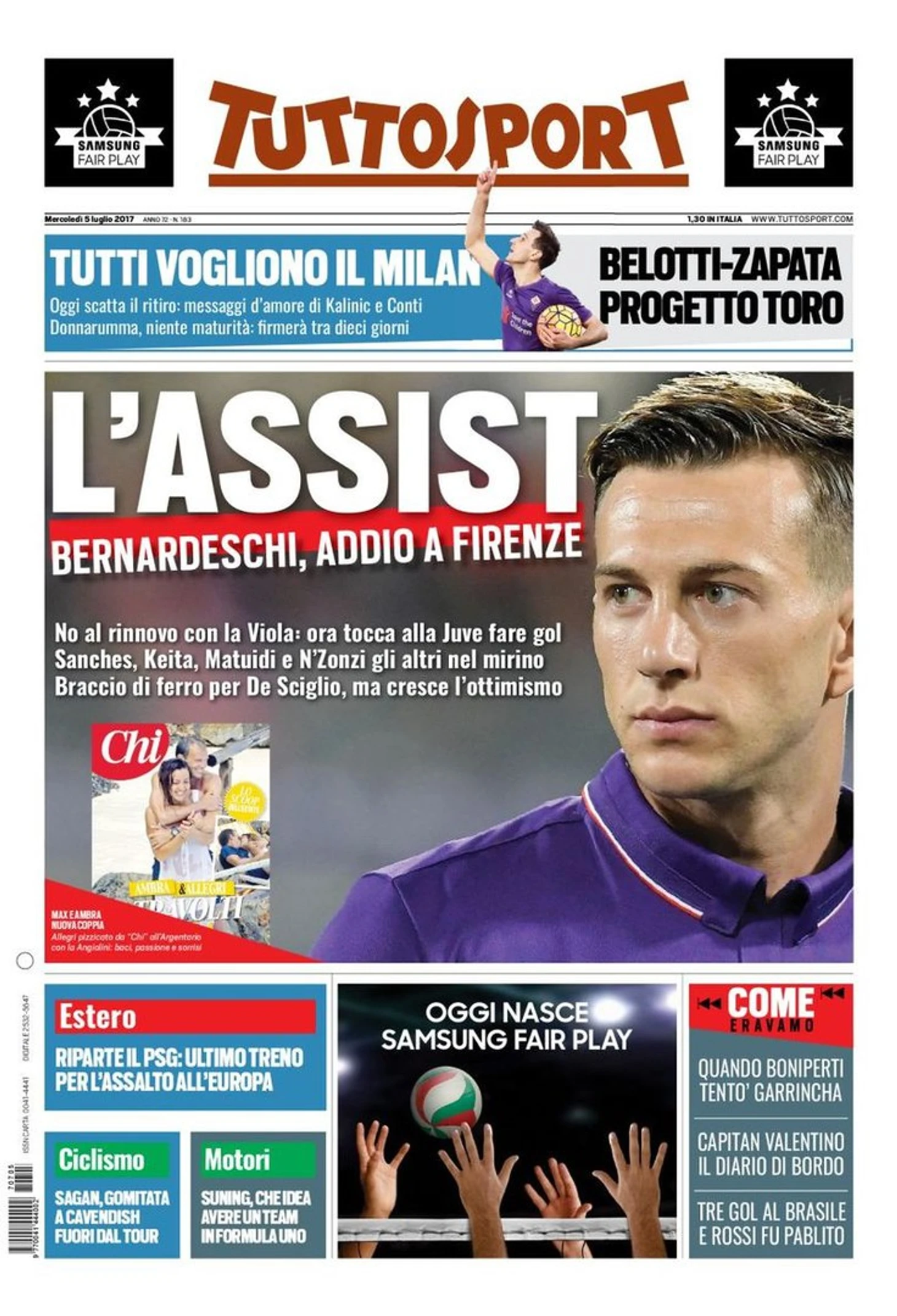 Бернардески, прощание с Флоренцией. Отказ от продления с «фиалками»: теперь дело за «Юве» достичь цели. Саншеш, Кейта, Матюиди и Н’Зонзи – остальные игроки в поле зрения. Перетягивание каната по Де Шильо, но растёт оптимизм.