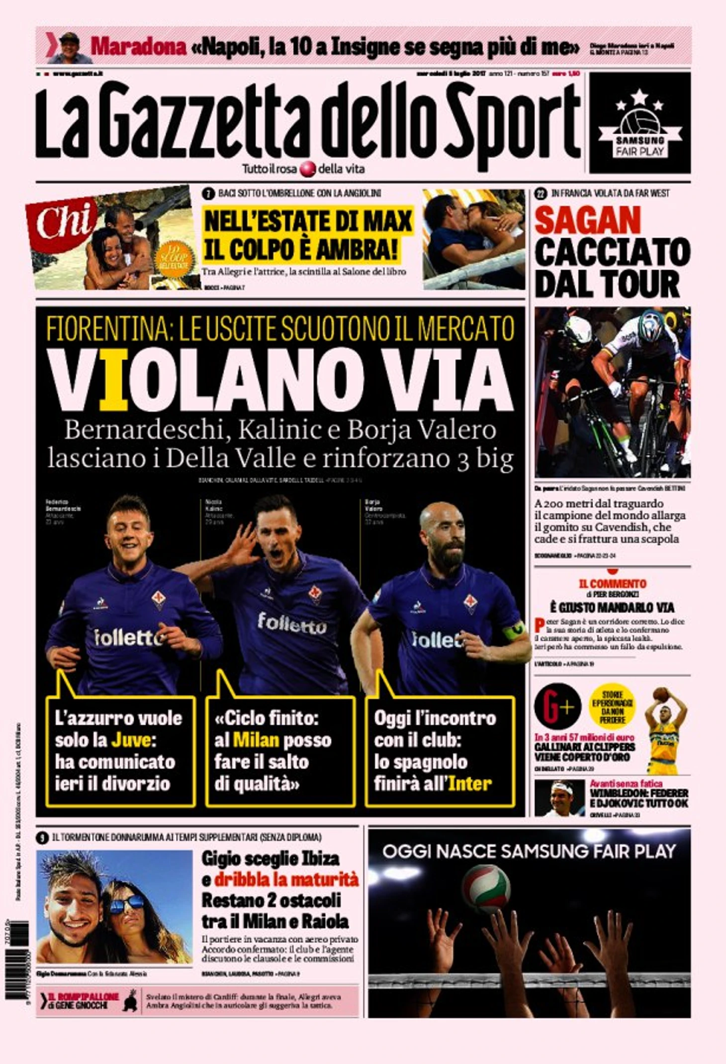 «Фиорентина»: уходы перетряхивают рынок. Бернардески, Калинич и Борха Валеро покидают Делла Валле и усиливает 3 топ-клуба. Игрок сборной хочет только в «Юве»: вчера он объявил о расставании. Калинич: «Цикл закончен, в «Милане» смогу сделать качественный скачок». Сегодня встреча с клубом, испанец в конечном счёте окажется в «Интере».