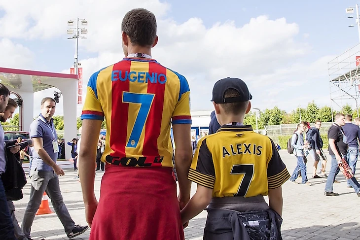 14. На русских стадионах появились футбольные формы, которые обычно живут в коллекциях или европейских фан-шопах. Понятно, что было много «Барселоны» или «Реала» с надписями Месси, Денчик и Семеныч, но ими все не закончилось. На матчах Чили мы все находились немного на «Эмирейтс», потому что это был вечер болельщиков «Арсенала», их красных, желтых, темно-синих футболок и приветствий «Come on, Arsenal». Еще были «Аякс», ПСВ, «Фенербахче» и неожиданно много «Валенсии».