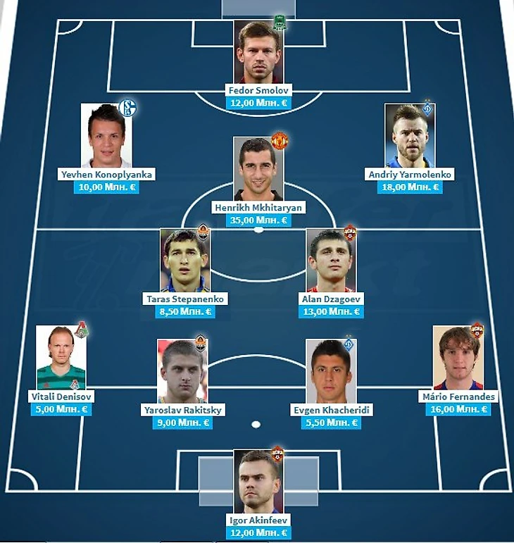 Тут есть несколько выделяющихся персонажей, описывать присутствие в сборной которых не стоит. Все итак понимают, то они сильнейшие: Мхитарян - безусловный лидер этой сборной и главная звезда, Ярмоленко и Коноплянка - лучшие игроки Украины этого времени, ну и Дзагоев - самый сильный россиянин в полузащите в данный момент, все это подтверждают и их ценники. Но есть одно но, поскольку Коноплянка может играть второго форварда, его я отправлю в сборную в качестве нападающего, ибо нет на постсоветском пространстве игрока, кроме трех выбранных еще, кто сыграет второго нападающего сильнее Евгения.