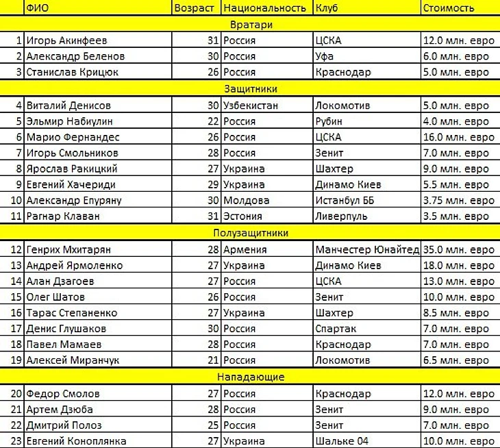 4 представителя Зенита, по 3 представителя ЦСКА и Краснодара, по 2 из Локомотива, Шахтера и Динамо Киев и по игроку из Ливерпуля, Манчестер Юнайтед, Шальке 04, Истанбула, Уфы и Рубина.
