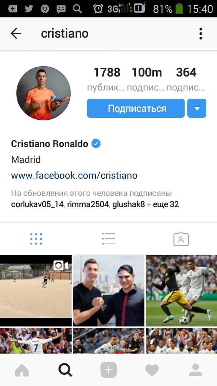 А в фейсбуке у него более 120 миллионов подписчиков, в твиттере 52 миллионов читателей. В совокупности в социальных сетях у Роналду свыше 270 миллионов подписчиков. У того же Леонеля Месси в фейсбуке свыше 88 миллионов подписчиков, а в инстаграме около 70 миллионов подписчиков, в твиттере 2 миллионовчитателей (в твиттере скорее всего его фонда аккуант) в совокупности 160 миллионов подписчиков.
