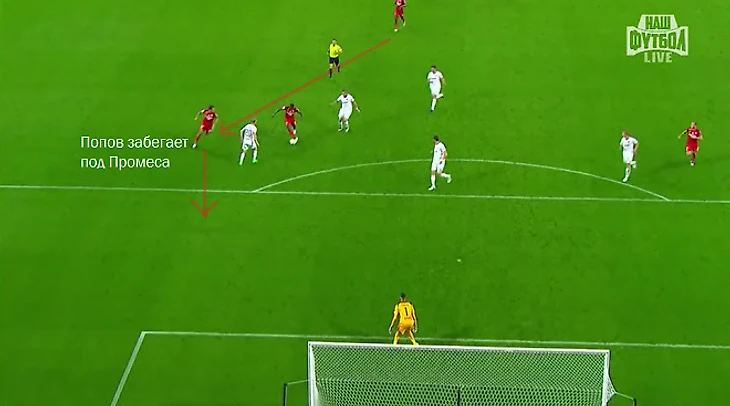 2. К слову о забеганиях Попова – именно так и был создан самый острый момент Ивелина в матче. Болгарин разогнал контратаку через центр, отдал мяч Промесу и резко забежал за него.