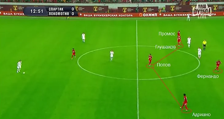 При этом без мяча «Спартак» перестраивался на схему 4-1-4-1. Луис Адриано, деливший атаку с Зе Луишем, опускался на левый фланг, Глушаков перемещался примерно на одной линии с Поповым, а Фернандо оставался в любимой роли страхующего. Адриано на фланге – вещь очень странная, но жизнеспособная: в ряде ситуаций именно бразилец страховал Комбарова, а не наоборот. Что, если в Адриано Массимо Каррера видит своего Марио Манджукича? В его возможности, как левого полузащитника, тоже не особо верили.