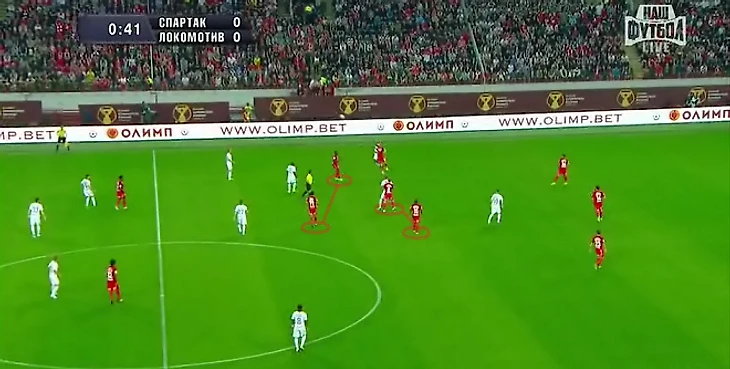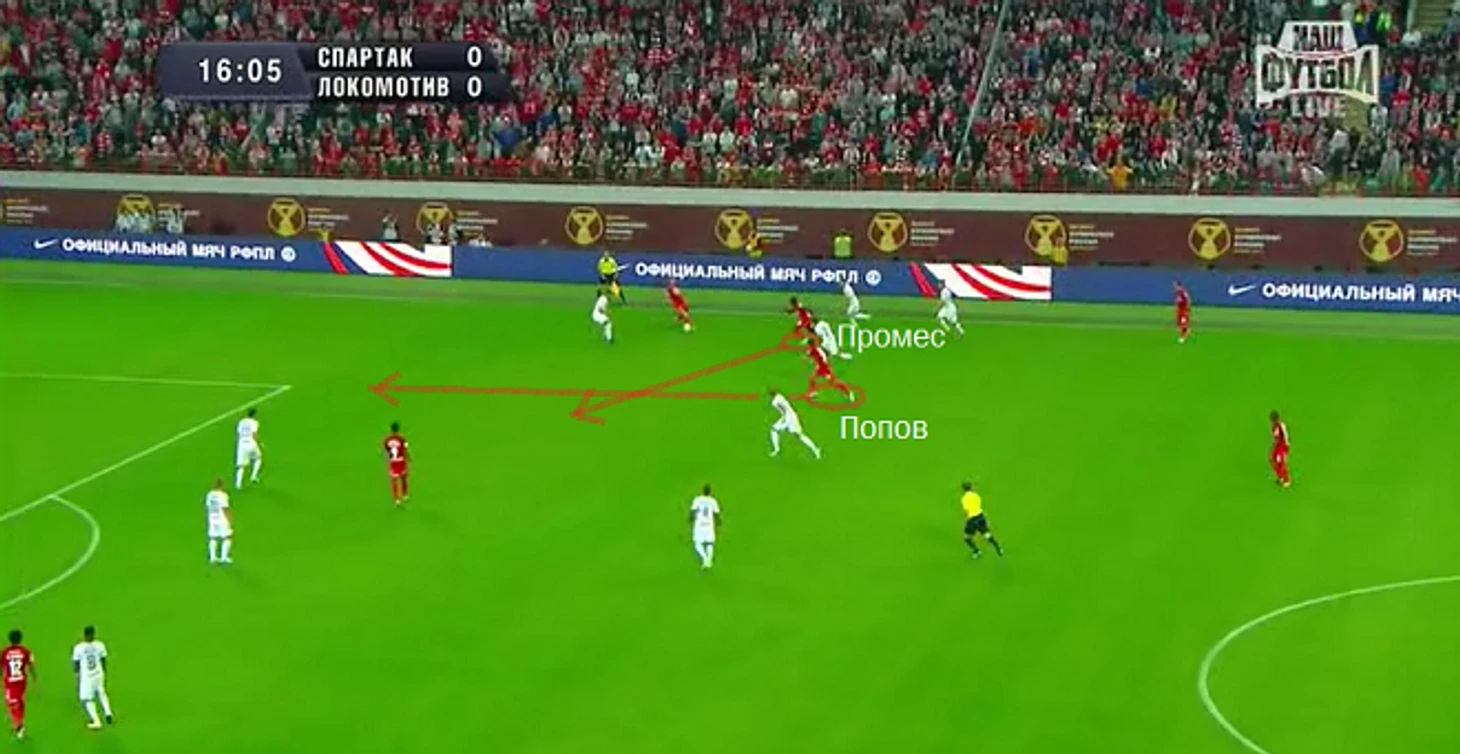 Так «Спартак» встречал удар Гилерме от своих ворот: четыре полузащитника насыщали квадрат, куда должен был полететь мяч, при этом никто из них не вступал в борьбу. Это не единственный привкус энергетика во вчерашней тактике красно-белых. Как и «Лейпциг», «Спартак» активно играл на смещениях двойки атакующих полузащитников – Попов и Промес то уходили в центр, чтобы открыть фланг под забегание Комбарова или Ещенко, то насыщали одну зону, то менялись полуфлангами при атаке. Как и «Лейпциг», «Спартак» делал ставку в первую очередь на позиционную структуру: Комбаров и Попов, Ещенко и Промес могли меняться местами (один на фланге, другой на полуфланге), но в своих связках соблюдали правильную игру по позиции.