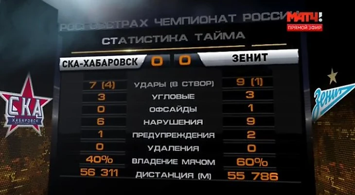 Преодолев 15-ти минутный рубеж Зенит взял мяч под свой контроль. Опасно из-за пределовов штрафной бил Паредес, но Довбня перевел мяч на угловой. В принципе игра шла так, как и ожидалось. Зенит на протяжение всего тайма владел приемуществом, но Хабаровчане отбивались без особого для них труда и опасных моментов у ворот Довбни практически не было. Тайм клонился к логическим 0-0 и так он и закончился. Удивили 9 ударов по воротам Зенита в первом тайме, Питерцы ответили семью, и только один раз попали в створ.