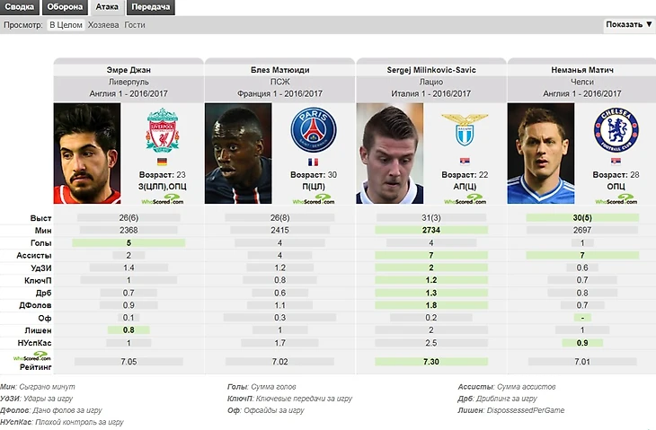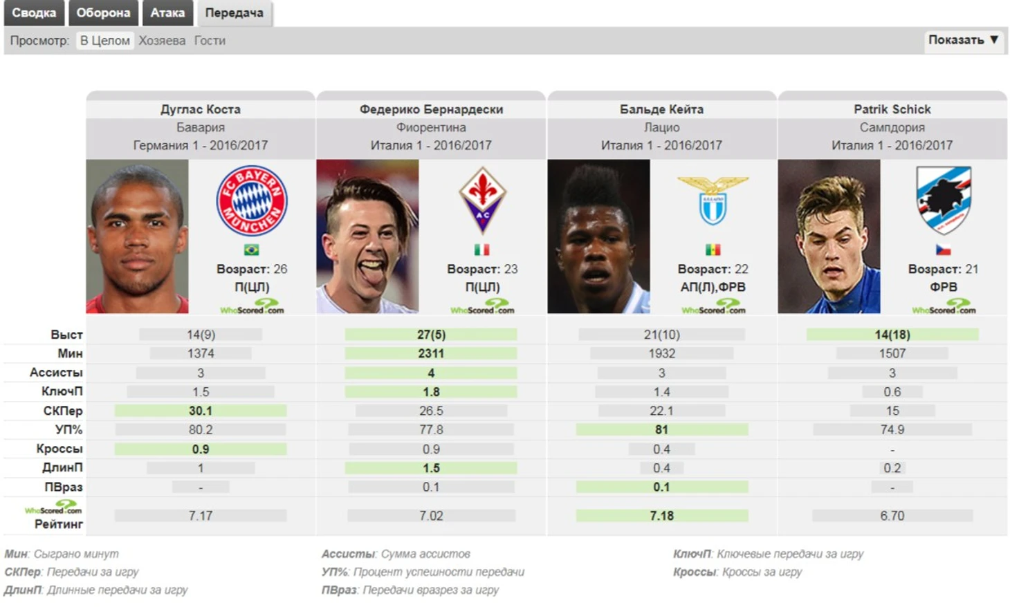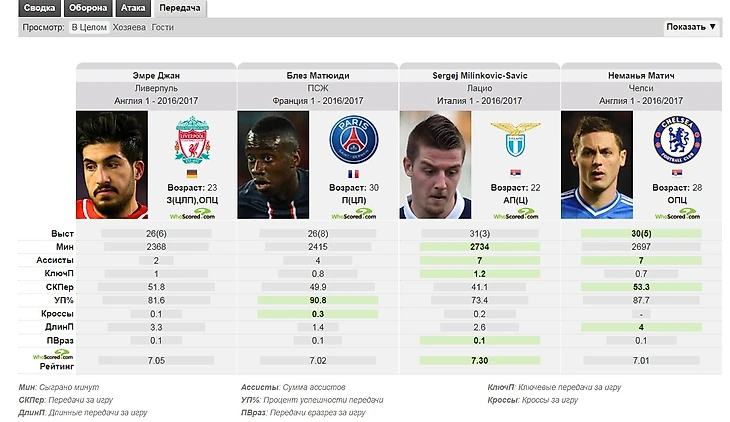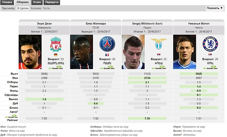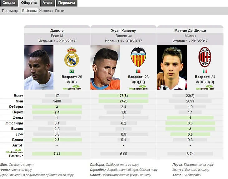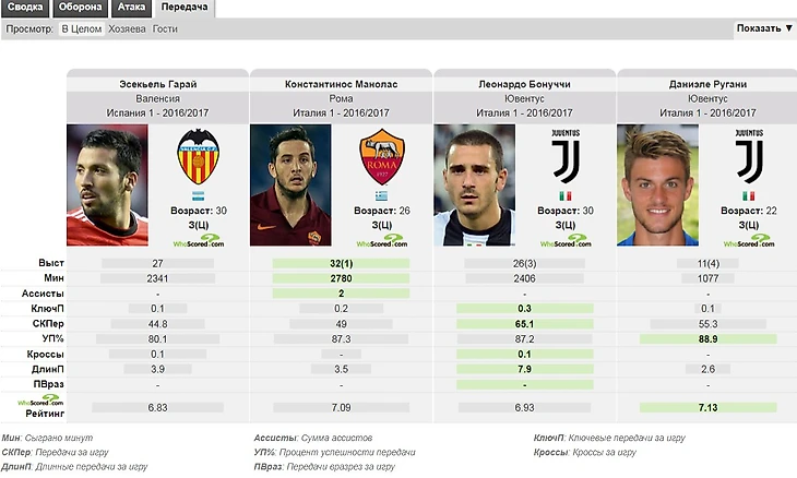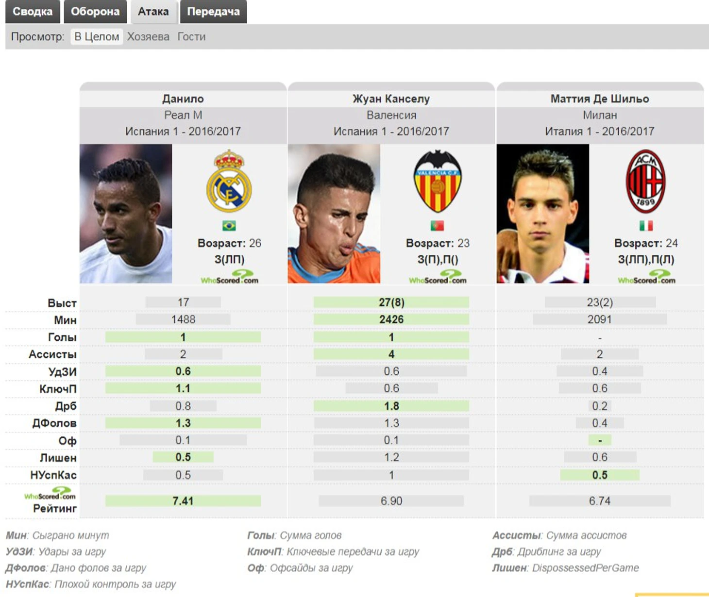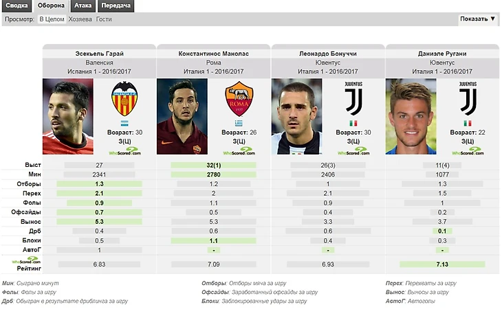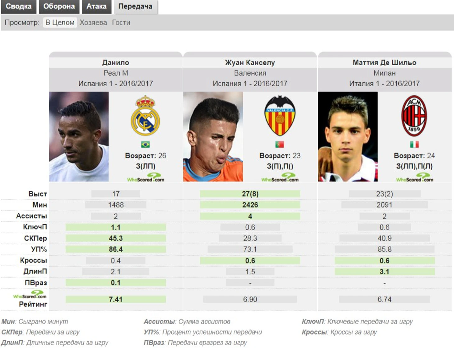 В этой категории я решил сравнить почти перешедшего Данило, потенциального новичка Канселу и состоявшего Де Шилье. Маттиа уступает Данило и Канселу практически по всем ключевым показателям, как в обороне так и в атаке. Справедливости ради, сезон у Маттиа совсем не задался, настроя не было никакого и, поговаривают, что он уже давно мыслями был под руководством Аллегри. Сумеет ли игрок возродиться в команде любимого алленаторе? Мы все видели, как хорош может быть Де Шилье. Он прекрасно отыграл на Евро. Маттиа молодой, ему есть куда расти, хочется в это верить. Из положительных моментов стоит отметить достойную культуру паса- 86% точных передач и превосходство над конкурентами в длинных передачах. Ну и, конечно же, большим плюсом является универсальность Де Шилье. Что касается Канселу, то он очень продуктивен в атаке, что подтверждает его углубленная статистика. Валенсия интересовалась Леминой, Ювентусу интересны Канселу и Гарай. Посмотрим, что из этого выйдет.