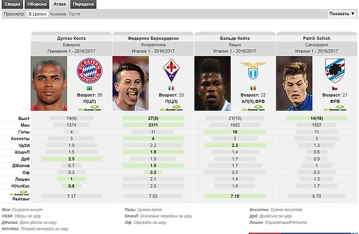 Коста уже наш, Шик теперь уже не наш. Кейту и Бернардески ждем с распростертыми объятиями. Игра Шика мне очень нравится, но он почти по всем показателям уступает Бальде. В пользу Кейты также его полная адаптация к Сериалу, в отличие от Шика, которому все же грозит синдром второго сезона. Если получится подписать Кейту, то можно будет перестать вспоминать чеха ибо Кейта, как минимум, не хуже и по всем показателям превосходит Патрика. Бернардески и Кейта очень универсальные игроки, способные играть на 3-4 позициях. Из минусов Бернардески можно отметить его лидерство в таких показателях, как "плохой контроль за игру" и "лишен"(т.е у него отобрали мяч, если кому непонятно). Пожалуй, данные показатели являются следствием того, что Федерико порой излишне много брал игру на себя. В Ювентусе он вряд ли будет это делать. Культура паса у него на хорошем уровне. Кстати, болельщик Фиорентины в комментах описал мне все это так же замечательно, как и whoscored, за что ему спасибо еще раз. Бернардески и Кейта ничуть не уступают более опытному Косте по статистическим данным, но тут дело в том, что сезон у Косты не сложился, а Бернардески и Кейта наоборот выдали свои лучшие сезоны. Было бы прекрасно иметь восемь игроков атаки в обойме на четыре позиции в атаке при схеме 4-2-3-1. Игуаин, Манджукич, Дибала, Куадрадо, Коста, Пьяца, Бернардески, Кейта. Ну разве это не Шик и блеск? Убежден, что времени хватит всем в борьбе на три фронта. К тому же первые полсезона Марко будет только набирать форму. У Реала, например, скамейка была еще более длинной и звездной, но времени хватило всем. Если не изменяет память, то каждый сыграл не меньше 20 матчей. Атакующая мощь Юве обещает быть просто наимощнейшей. Остается только надеяться, что Маротта и ко поскорее приведут Бернардески и Кейту.