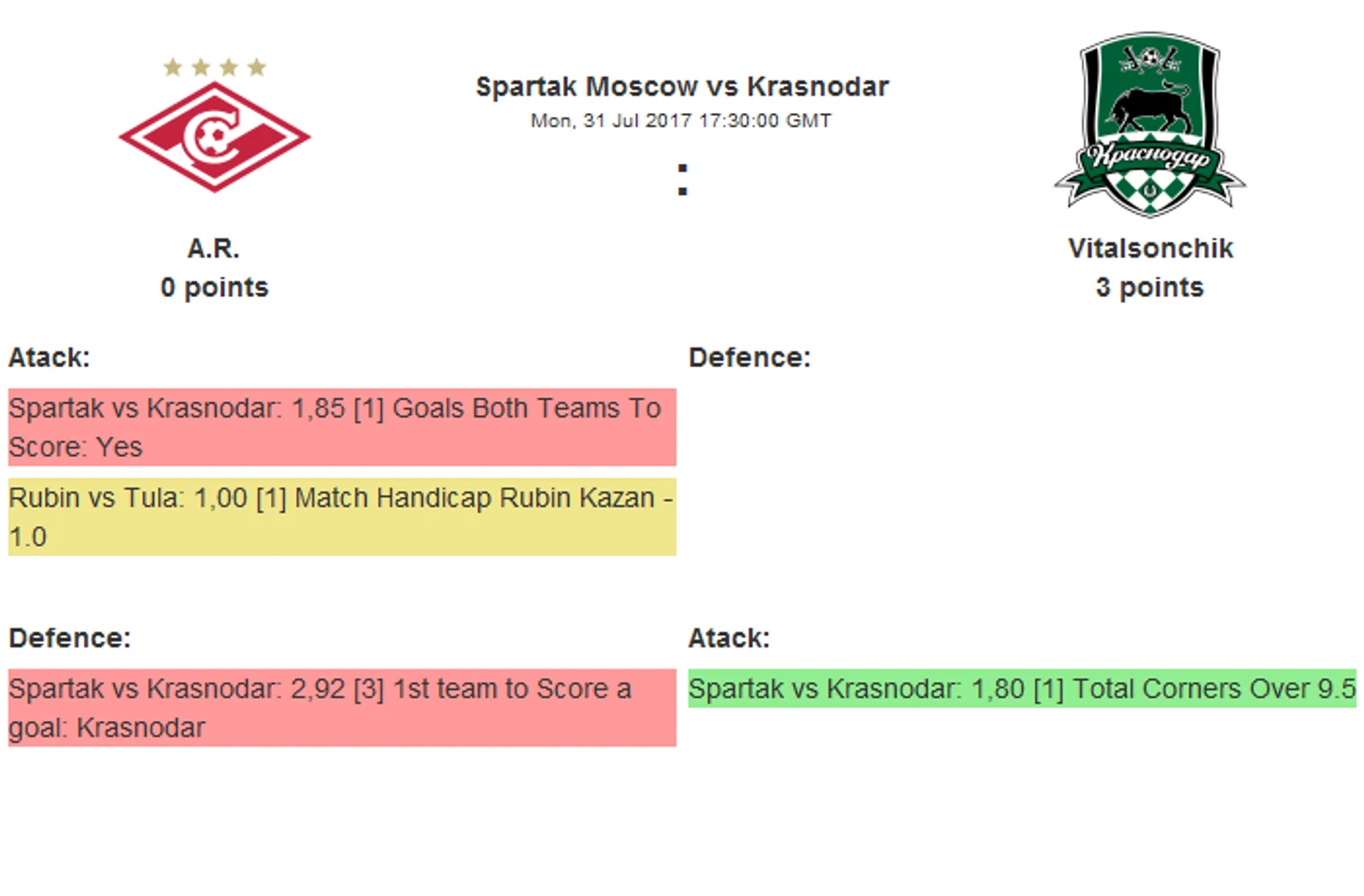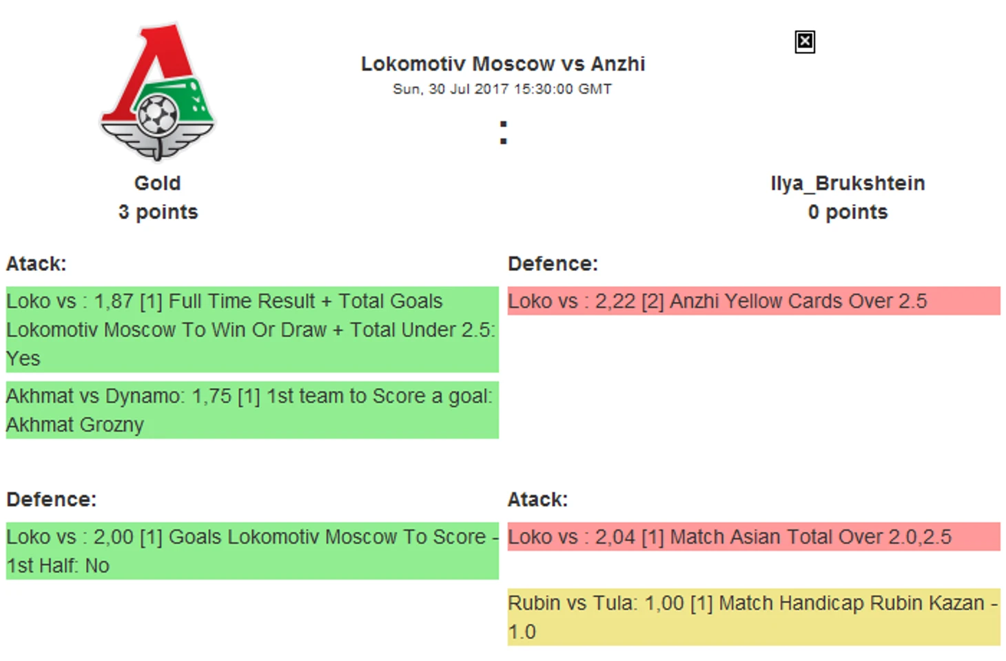 Ну и последнее, одним из самых сильных качеств тренера Григоряна, на мой взгляд, кроме умения жжечь на пресс конференциях, является умение смотивировать команду на борьбу, несмотря на любой сценарий матча, к тому же дополнительным стимулом для Анжи может служить тот факт, что последнее очное противостояние в Москве закончилось со счетом 4-0 в пользу Локо. На этом все, спасибо всем кто прочитал описание, надеюсь данная информация будет для Вас полезна...
